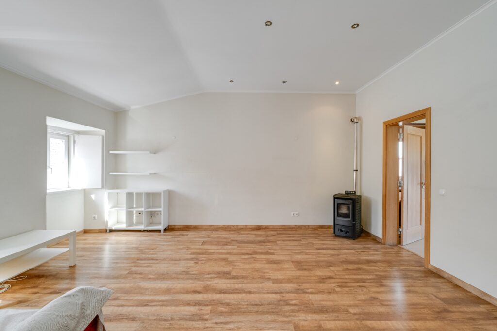 Spacious and cozy living room with two windows and a pellet stove